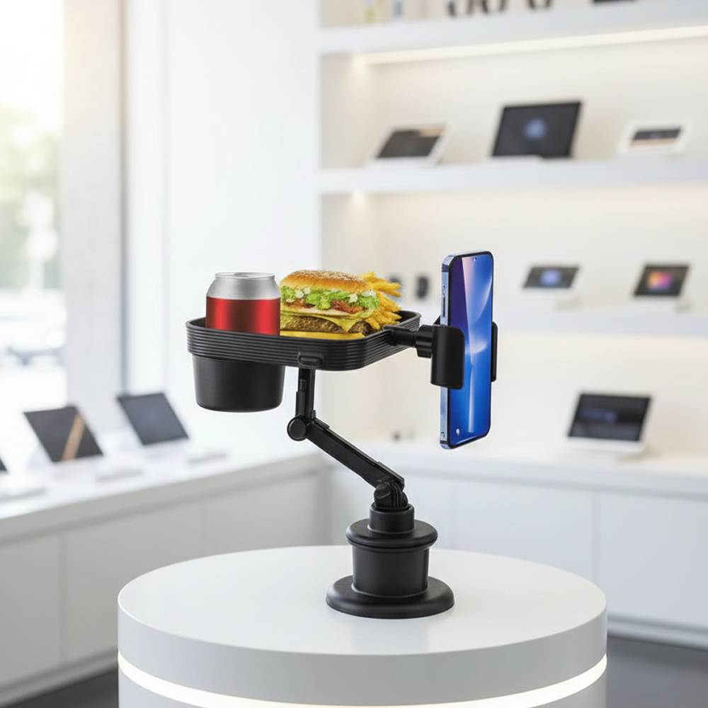 • تصميم ذكي 2 في 1 يجمع بين حامل أكواب وحامل هاتف في قطعة واحدة